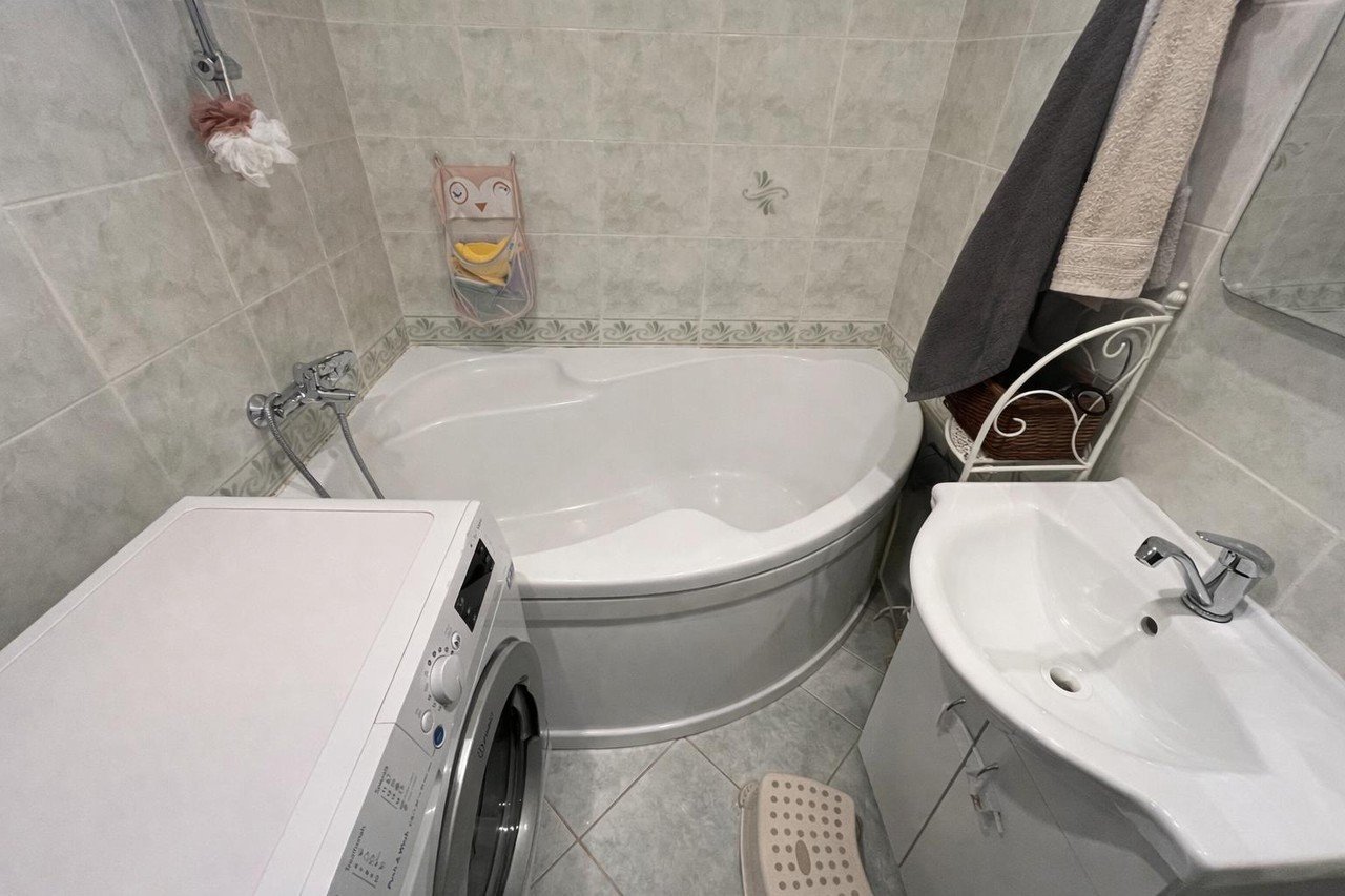 V koupelně se nachází rohová vana a umyvadlo s místem pro pračku. WC je samostatné.